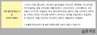 참여업체 목록: 11번가, NOL, 가고파여행, 구공스테이, 꿀스테이, 넥스투어, 노랑풍선, 놀이의발견, 데이오프, 돌하루팡, 땡큐캠핑, 떠나요닷컴, 마이리얼트립, 맘맘, 미스터멘션, 반려생활, 버틀러라운지, 스테이앤모어, 스테이폴리오, 에스에스지닷컴, 여기어때, 오늘밤엔, 옥션, 올마이투어닷컴, 웹투어, 위홈, 제주닷컴, 지마켓, 카모아, 카카오톡 예약하기, 쿠팡 트래블, 트립비토즈, 트립토파즈, 파인스테이, 펀앤비즈, 페텔, 하나투어, 한투어, 호텔엔조이, 호텔패스